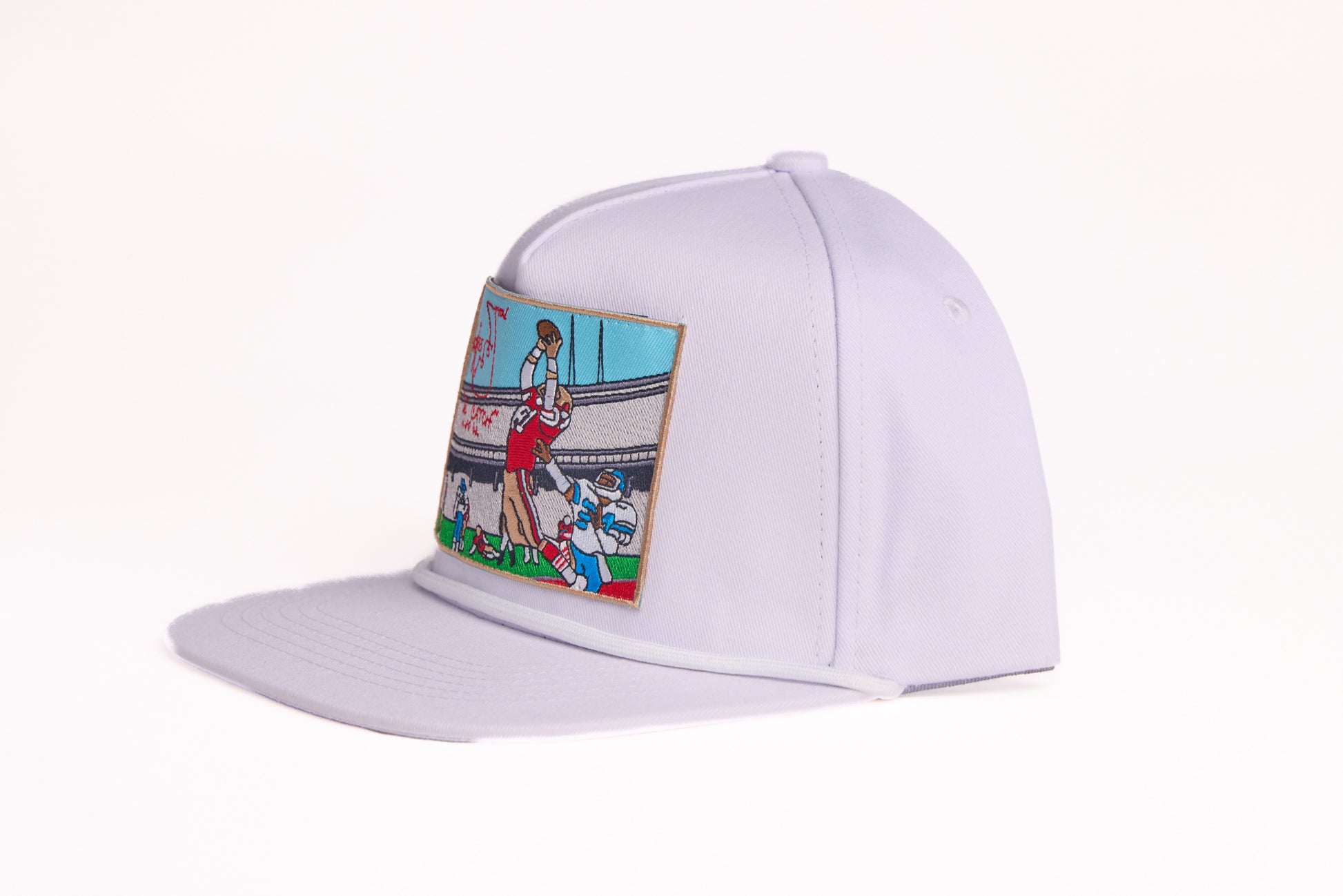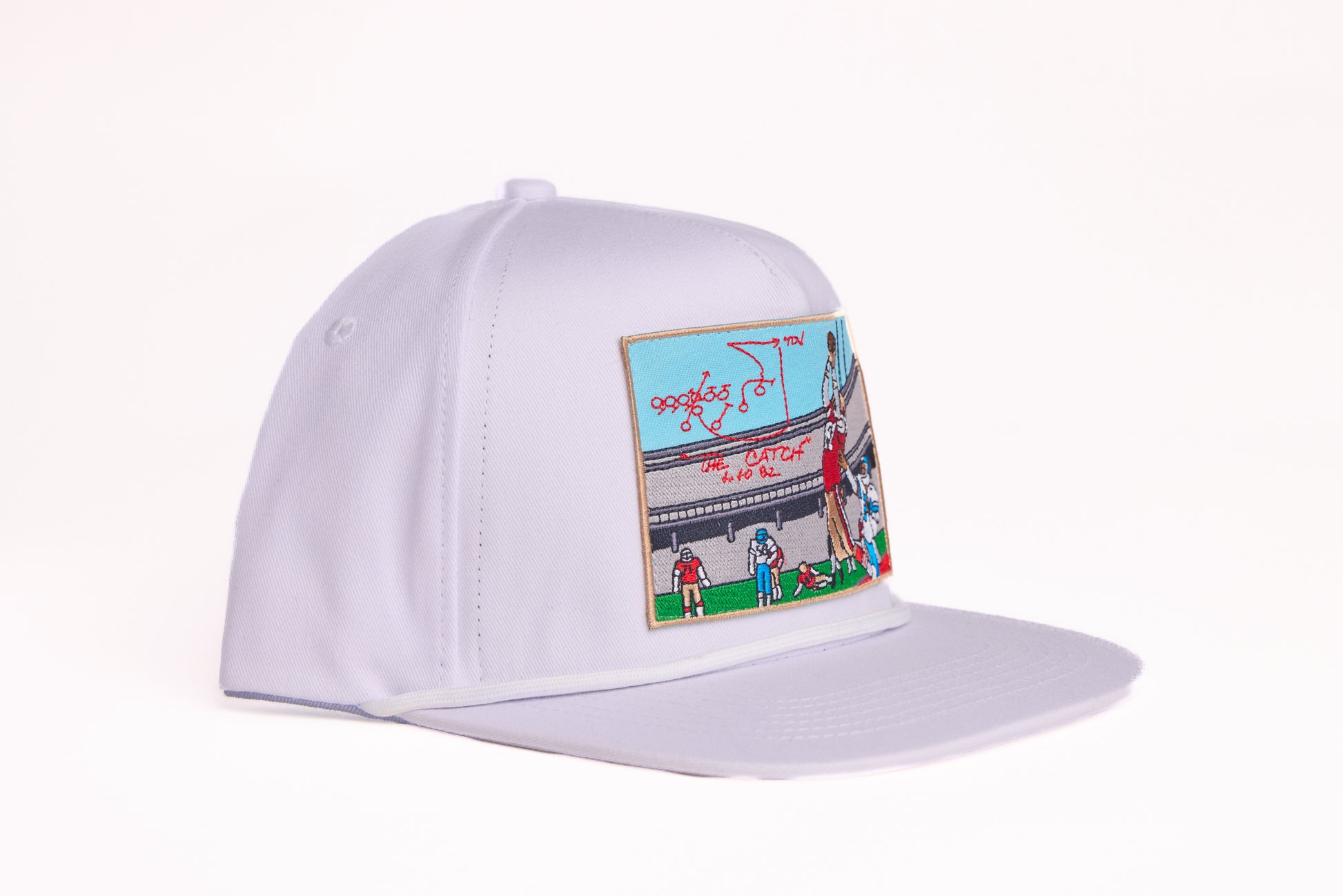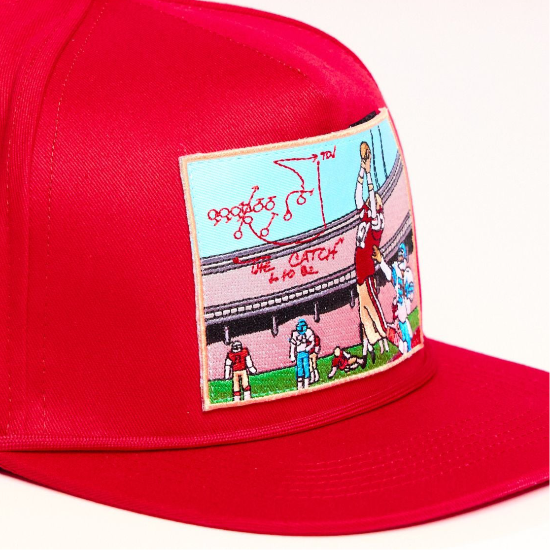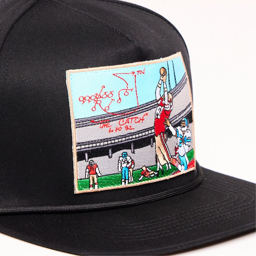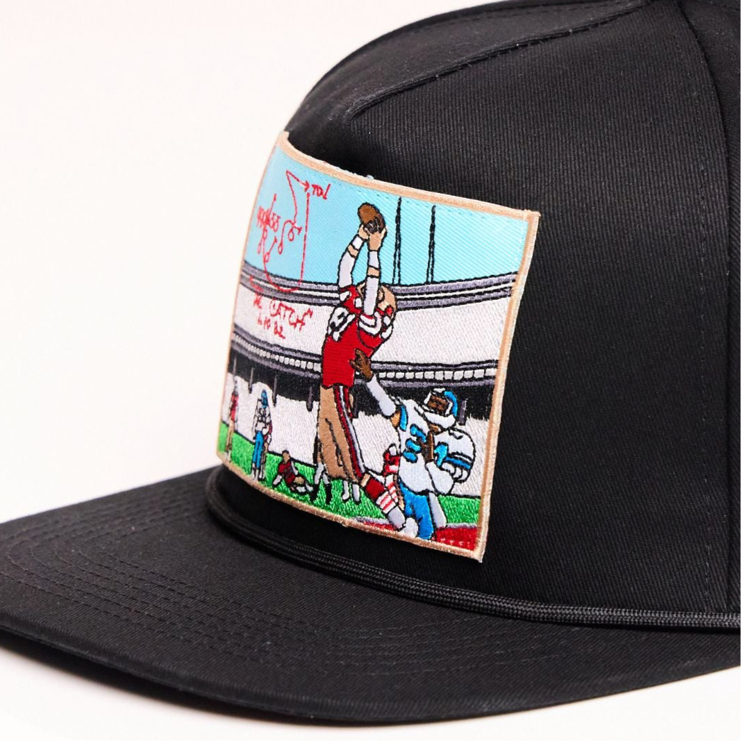 Upgrade your accessory collection with the INFILTRATOR™ "The Catch" Snapback Hat and enjoy the perfect blend of sports history, functionality, and exclusivity. This unique hat features a vivid illustration of the legendary football play known as "The Catch," complete with a player making the iconic leaping grab and the actual play diagram.